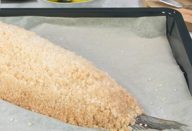 Hel havbars indbagt i en krydderurteinfuseret havsaltdej, stegt til den er perfekt mør, derefter forsigtigt åbnet og serveret med et stænk olivenolie.
