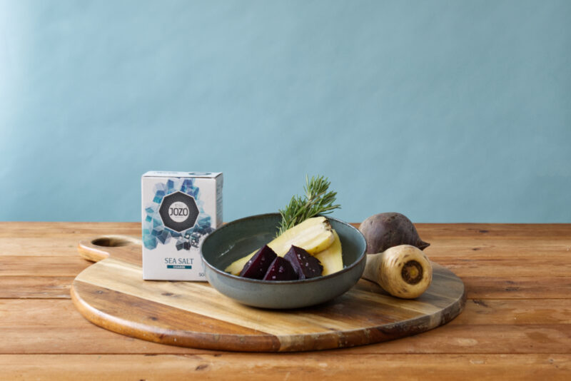 Rote Bete und Pastinaken, in einer groben Salzkruste mit Kräutern umhüllt, zart geröstet, anschließend geschält und mit einem Schuss hochwertigem Olivenöl verfeinert.