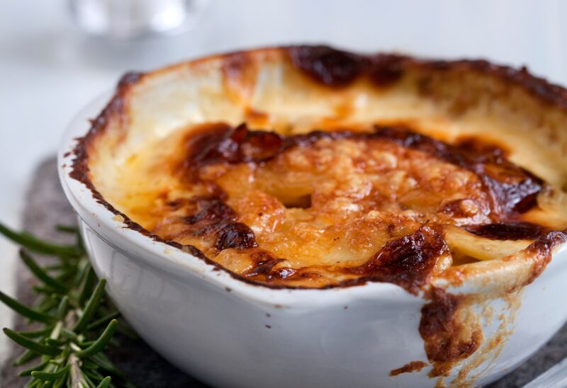 Aardappelgratin met gedroogd eekhoorntjesbrood. Romige aardappelgratin is altijd een favoriet en we maken het net even wat spannender met gedroogd eekhoorntjesbrood en smaakvolle kaas.