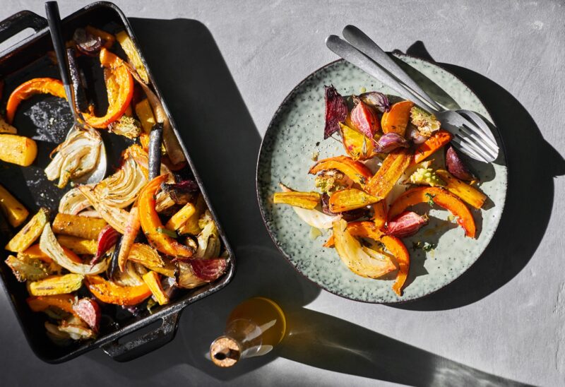 Blandade grönsaker ringlas med olivolja, strös med vitlök, timjan, rosmarin och fint jodiserat salt och rostas sedan tills de är mjuka och doftar gott.